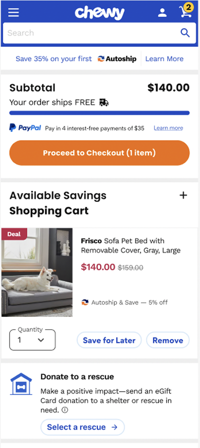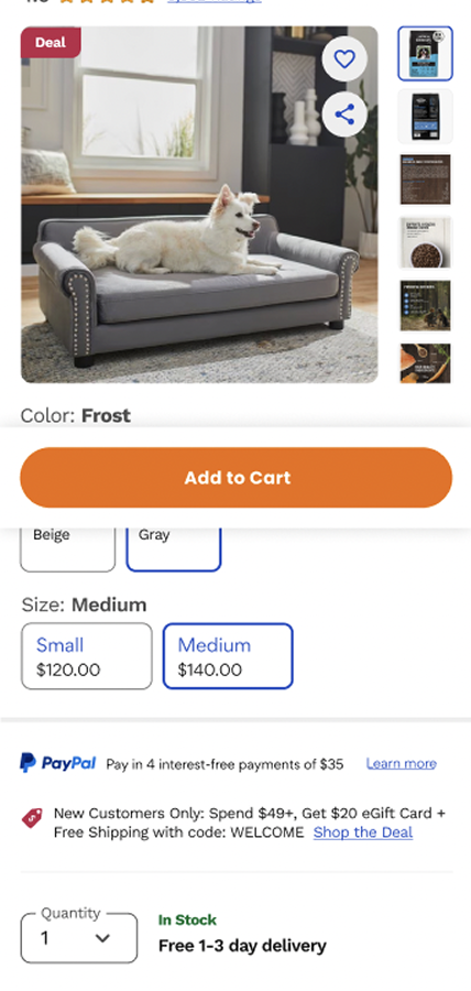 PayPal was already available as a payment method on Chewy and had the second highest volume. We decided to partner with PayPal and their existing payment plans to enhance payment flexibility. We also wanted to drive awareness and adoption of Buy Now Pay Later, and reduce cart abandonment.