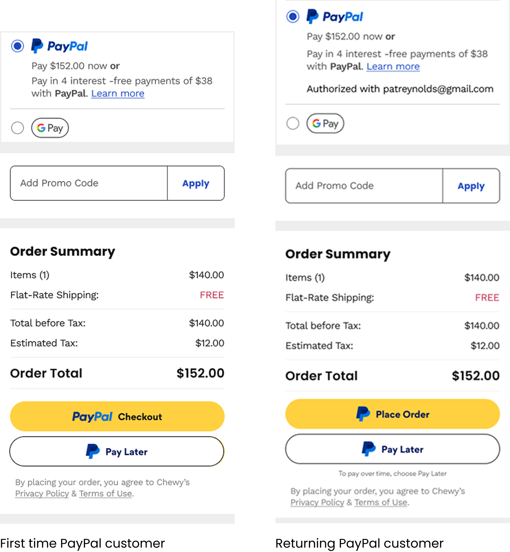 While auditing the current experience for PayPal on Chewy, I realized it deviated from other payment methods on Chewy, making first time customers have to connect their PayPal account off Chewy and then have to come back and place the order.